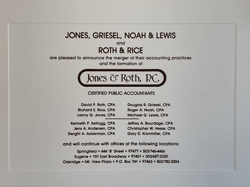 The firm had become known as Jones, Griesel, Noah, & Lewis. In 1981, they were approached by David Roth and Dick Rice to discuss a potential merger with their firm, and they merged in 1982. They agreed on a name: a simple combination of the two firms’ managing partners Lanny Jones and David Roth: