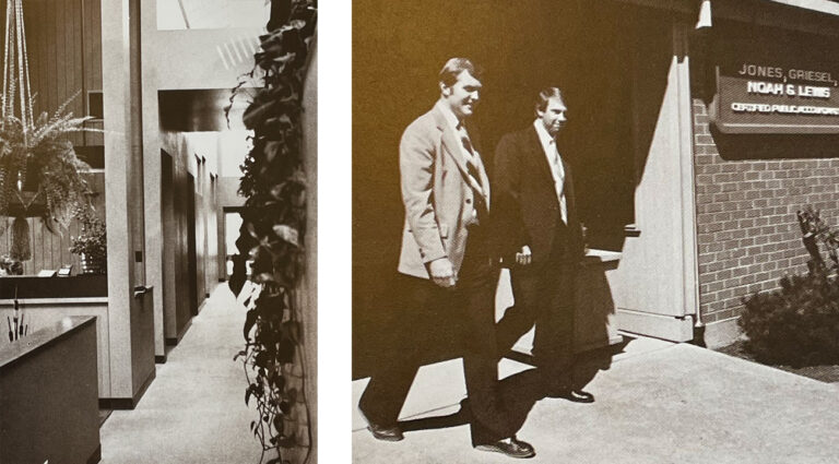 Left: The office interior at 444 B Street. Right: Doug Griesel (left) and Roger Noah (right) outside the Springfield office of Jones, Griesel, Noah & Lewis circa 1979.